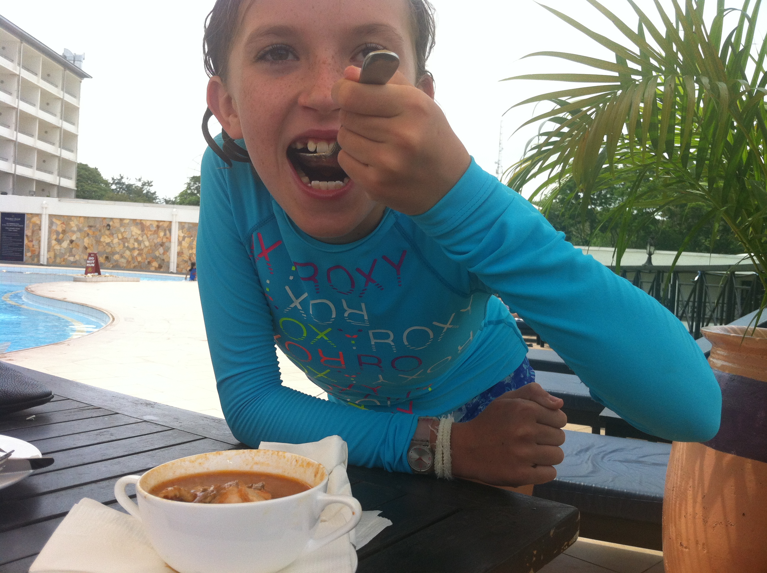 Despite the 5 star surroundings, I did manage to squeeze one traditional dish into lunch, the light soup. It is a tomato based, cloudy broth, quite spicy, with a little oil. Mine had chicken pieces in it, but you can also have fish. What light soup is famous for though, is the base for fufu. Originating Ghana, fufu is boiled starch (like cassava or yam), which is pounded and pounded (and pounded) into an almost liquid consistency, and served with light soup. It is pounded in beautiful plain wooden bowls with a rounded stick, about 5 feet long. It is pounded straight down, and the length of the stick helps hit the starch with the greatest force. The fufu is eaten with your right hand, and the soup drunk straight from the bowl. I’m keen to try the real deal, Bill assures me its a texture you need to have grown up with.