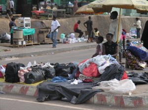 A bit of grocery shopping later, we decide a look at a small craft markets is a good idea. Thank goodness there is a 3 adult to 3 child ratio. Everywhere is busy, the roads, the footpaths, and there is always a little attention when 3 obruni kids walk past (it’s friendly, and involves smiles and handshakes). Embolden by the craft markets we decide to look for some fabric. We hop back into the car, and drive down to the Central Markets area. Kumasi market is the largest market in West Africa. 10,000 individual stall holders. In the market proper, there are no cars, but the streets around the market are still referred to as ‘Central Market’. Like a suburb, and no, the 10, 000 stallholders are not included in this section. It’s busy. I haven’t spent a lot of time in Asia, but I don’t think anything can quite prepare you for the assault on the senses that is an African market. There is so much stuff everywhere, piled high on the footpath, pinned to the walls, every spare space in these tiny shops full, your eyes are almost overwhelmed with sensory overload. Then there are the people. Throngs of people moving up and down the street, small vendors sitting on the gutter with their meager wares, everyone on a mission. And then there are the cars, buses, taxis. Oddly, very few motorbikes. Let’s just say there is a healthy disregard for road rules and the use of indicators. We can’t forget the smells of car exhaust, spicy cooking, rank drains and sweat. Bursts of music (hiplife!) as you pass shops (remember to turn the volume to 11). After an almost complete walk around a massive block, Francis found the fabric shops (shops of a similar type are often clustered together). Gorgeous wax prints in reds, greens, yellows and hot pinks.